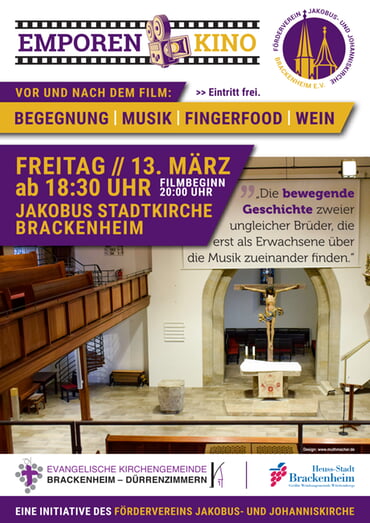 Herzliche Einladung zum Emporenkino am Samstag, 13. März 2026 in die Jakobus-Stadtkirche. Die bewegende Geschichte zweier ungleicher Brüder, die erst als Erwachsene über die Musik zueinander finden. Einlass ab 18:30 Uhr Filmbeginn um 20:00 Uhr. Vor und nach dem Film Begegnung, Musik, Fingerfood.